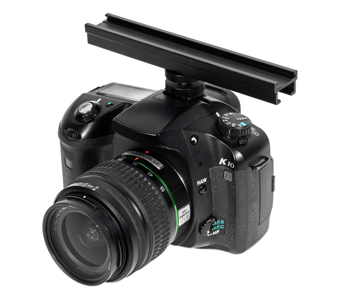 Manchmal ist mehr Kamerazubehör nötig, als auf einen Blitzschuh passt. Dafür gibt es diese Verlängerungsschiene, die es Ihnen ermöglicht, beispielsweise ein Leuchtzubehör sowie ein Mikrofon gleichzeitig an die Kamera anzuschließen.