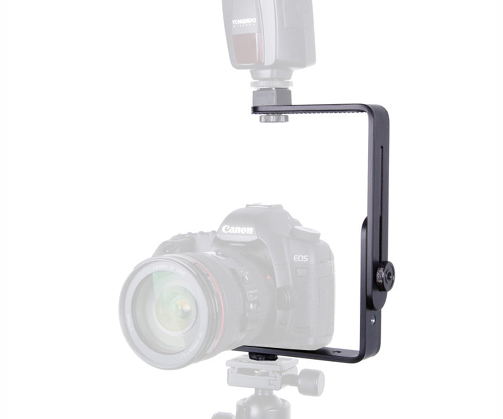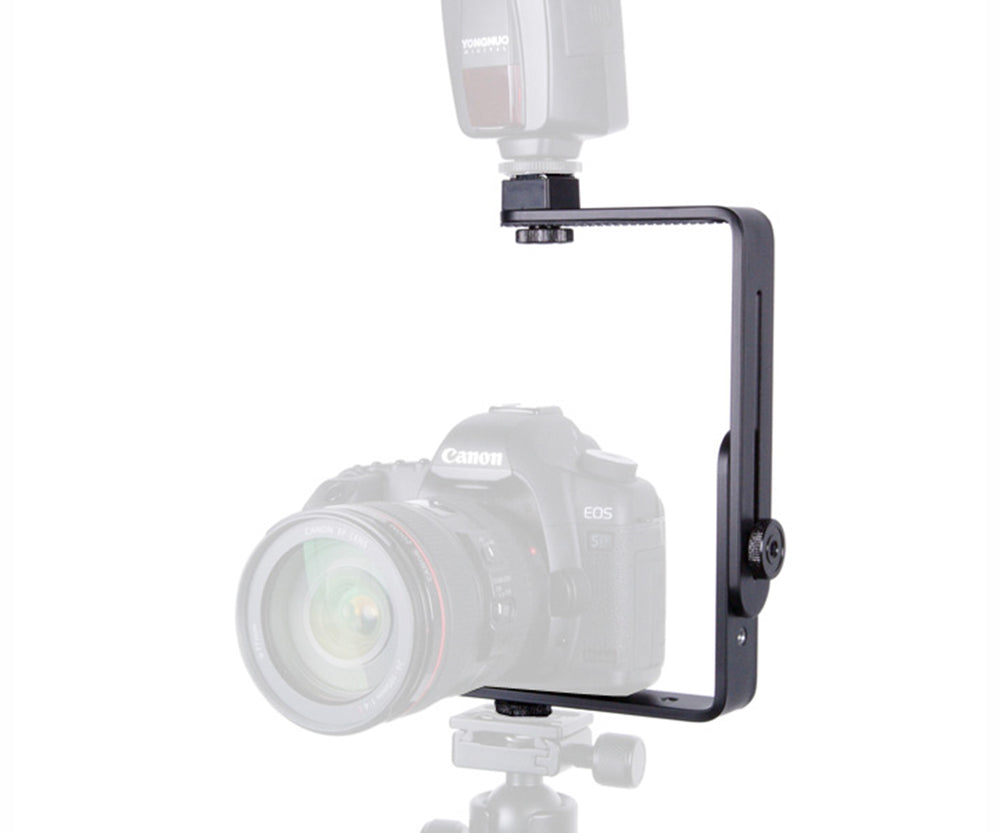 Die Blitzschiene verfügt über mehrere 1/4 Zoll Innengewinde, 4 Rändelschrauben mit Standard 1/4 Zoll Innen- und Außengewinde und lässt sich auf einem Stativ montieren.