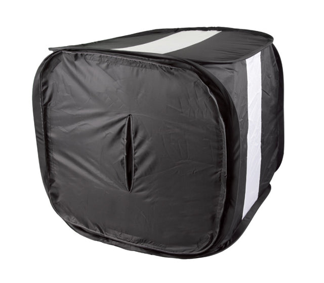 Für die Produktfotografie ist dieser Lichtwürfel ein unentbehrliches Hilfsmittel. Das zu fotografierende Objekt wird in den Würfel gesetzt und erhält durch den Stoff gleichmäßig gestreutes Licht. Schatten werden dadurch weicher und Reflexionen vermieden.Auch glänzende Gegenstände wie z. B. Schmuck oder Gläser können auf diese Art klar und unverfälscht abgebildet werden. Der Würfel kann von allen Seiten mit Blitz oder beliebigem Licht beleuchtet werden. Diese schwarze Ausführung hat an den Seiten und oben weiße diffuse Lichtschlitze und eignet sich besonders gut für helle oder stark glänzende Objekte.