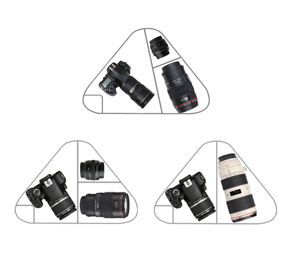 Im dreieckigen Hauptfach, das sich von zwei Seiten per Reißverschlussklappen öffnen lässt, befinden sich Polsterungen mit Klettband. Diese können Sie individuell versetzen und Ihre Kamera samt Zubehör wie Objektiv und Blitzgerät optimal verstauen. Die Doppel-Reißverschlussfächer lassen sich zusätzlich durch stabile Clips sichern.