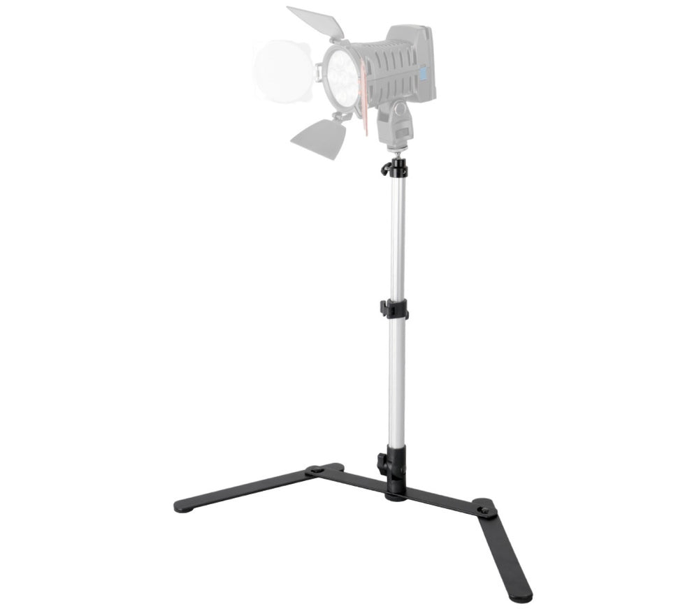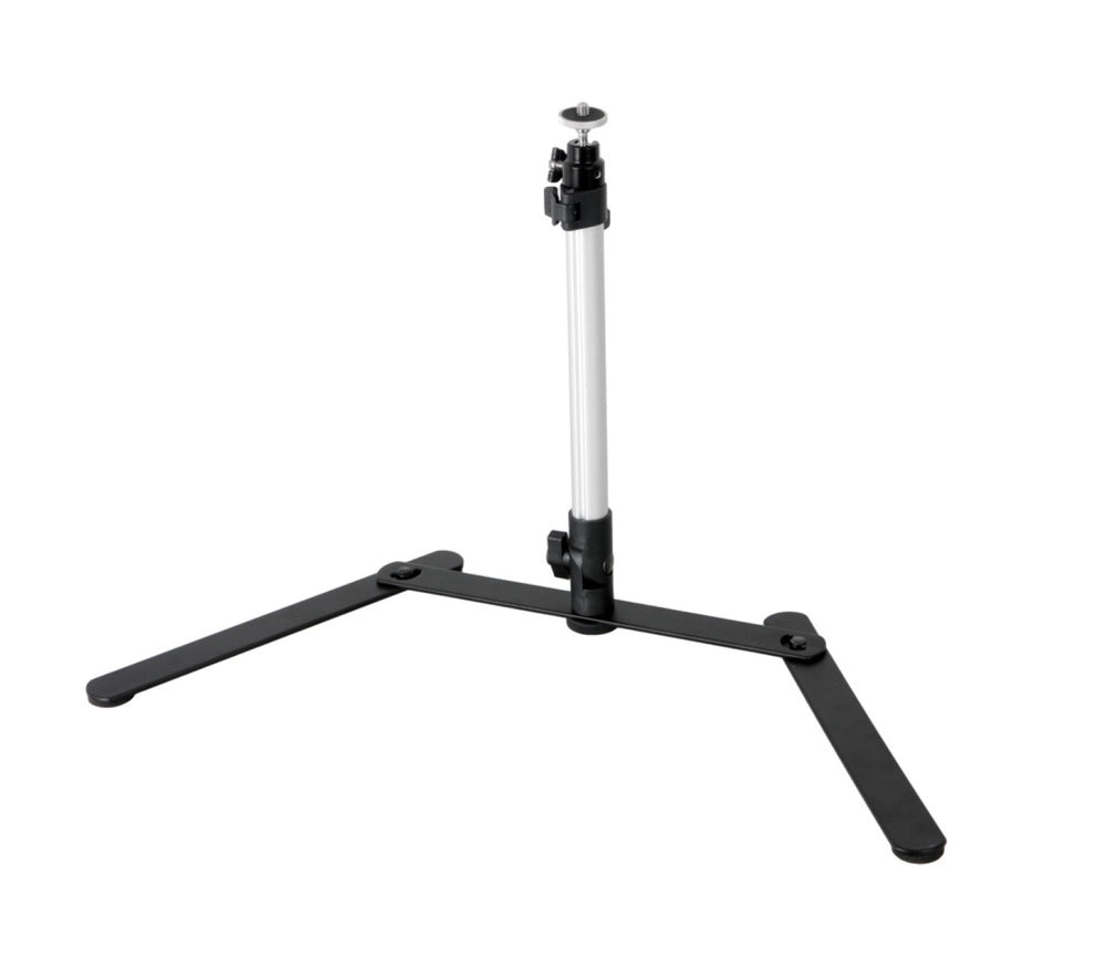 Auf diesem Tisch-Stativ können Sie Blitzgeräte und Videoleuchten montieren und individuell ausrichten. Das Stativ lässt sich neigen und im gewünschten Winkel arretieren.Durch die Verzahnung im Gelenk ist sicherer Halt gegeben. Der dreiteilige verstellbare Fuß sorgt dafür, dass das Stativ nicht kippt.