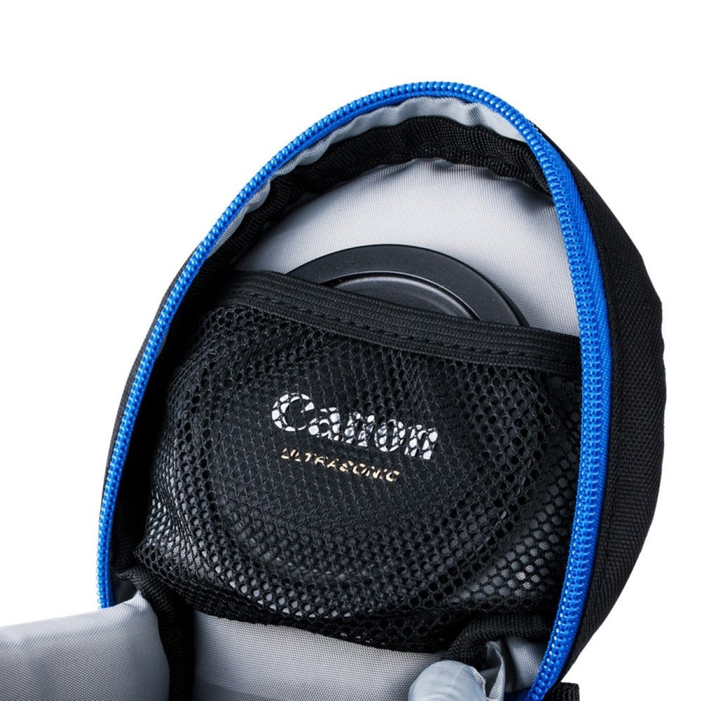 Die Tasche verfügt über einen tiefblauen Zwei-Wege-Reißverschluss mit einer Netz-Zubehörtasche im Deckel. Die beiden Reißverschluss-Schieber sind mit kleinen Schlaufen versehen, sodass sie mit einem kleinen Schloss gesichert werden können. Kleine Zubehörteile wie Objektivdeckel oder Fernbedienungen können in der Innentasche verstaut werden.
