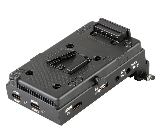 Diese V-Mount Platte bietet zahlreiche Anschlüsse mit unterschiedlichen Spannungen. Mit nur einem V-Mount-Akku lassen sich daher mehrere Geräte gleichzeitig mit Strom versorgen, wie z. B. Kamera, Monitor, Mikrofon, Videolampe usw. Zusätzlich ist ein HDMI-Splitter vorhanden und für Geräte mit höherer Spannung eine Powertap-Buchse.An der USB-Buchse können Handy, Tablet oder PC angeschlossen werden. Mit einem zusätzlichen Netzteil (nicht im Lieferumfang enthalten) lässt sich der Akku aufladen. Ebenso kann die Adapterplatte Ihre Geräte mit Strom über Steckdose versorgen.