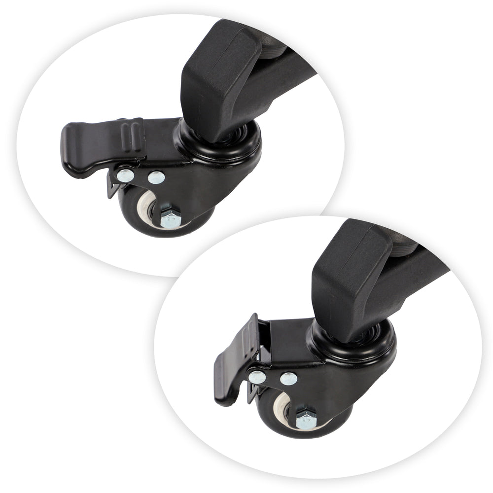 Die leichtläufigen Rollen bestehen aus Gummi, können sich um 360° drehen und lassen sich einzeln feststellen. Ihr Stativ gewinnt auf dem Wagen ca. 10cm an Höhe.