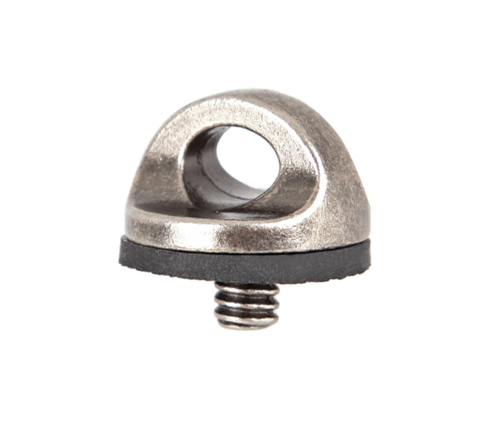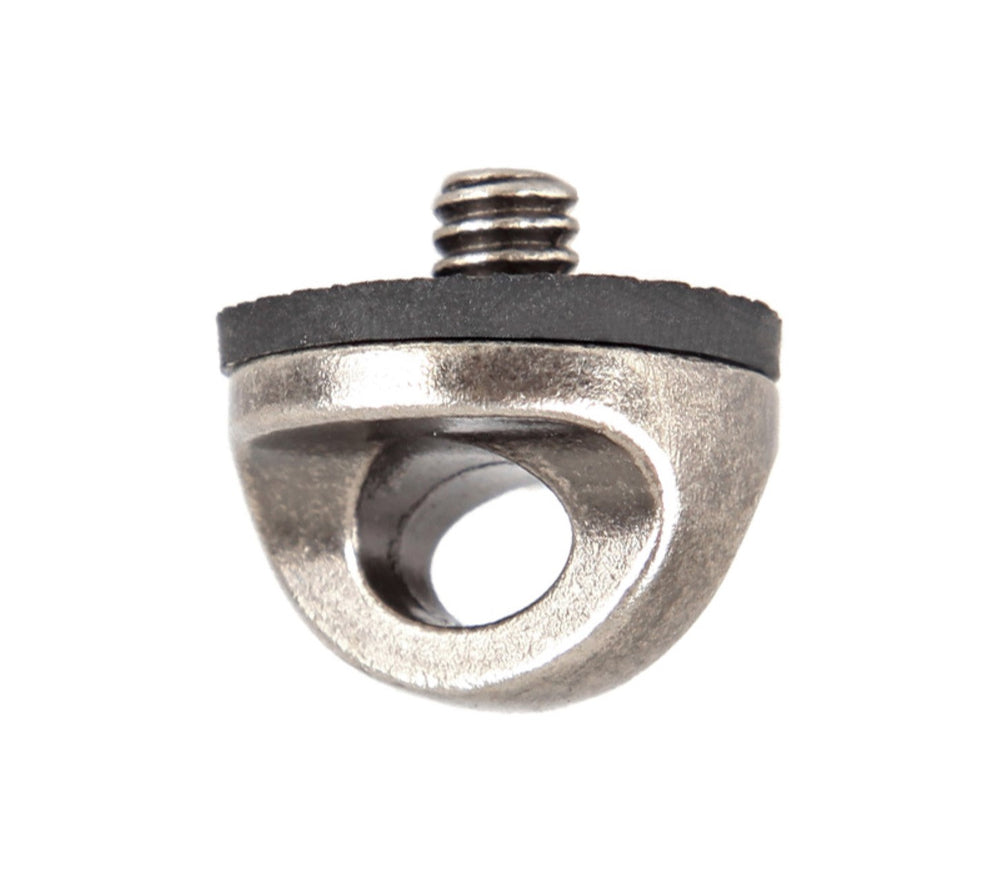 Die Adapter-Schraube besitzt ein ¼ Zoll Gewinde und kann daher in das Stativgewinde jeder gängigen Kamera geschraubt werden. Ein Gummiflansch mit geriffelter Oberfläche sorgt dafür, dass die Schraube sehr fest angezogen werden kann, um ein versehentliches Herausdrehen zu verhindern. Die Einhängeöse dient gleichzeitig als Griff zum bequemen Festziehen und Lösen.
