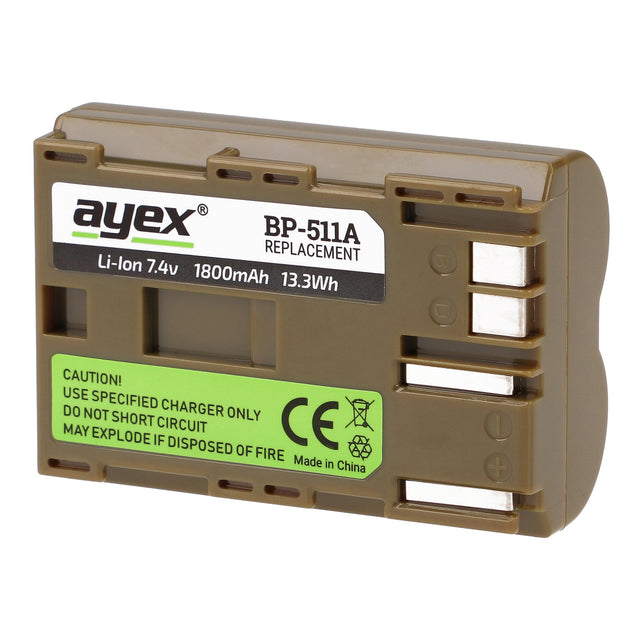 Der ayex Akku wie Canon BP-511a verfügt über umfassende Sicherheitsmerkmale wie Schutz vor Kurzschluss, Überladung und Überhitzung. Diese Funktionen sorgen für einen sicheren Betrieb und tragen zur Langlebigkeit Ihrer Kamera und des Akkus bei.