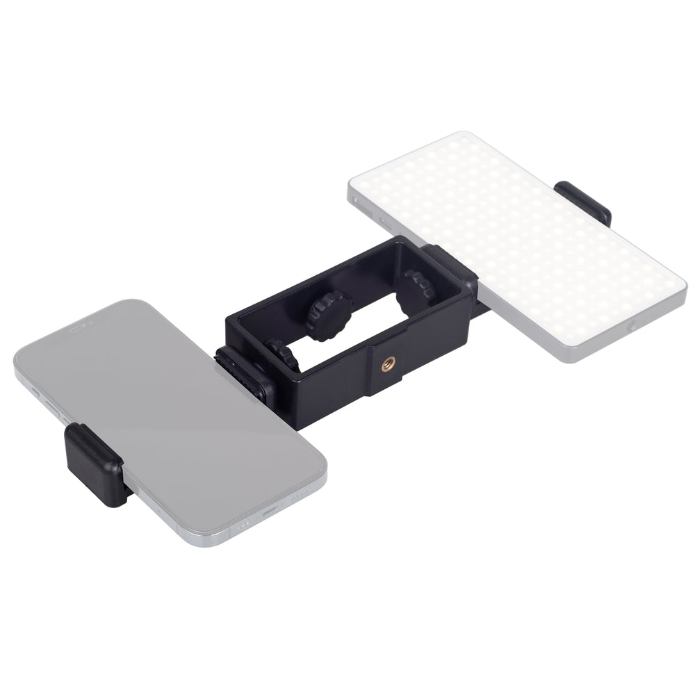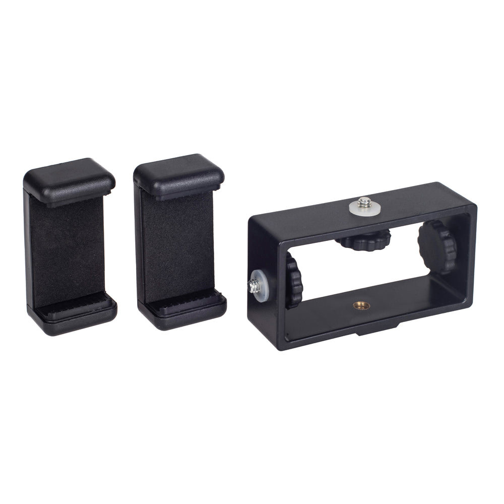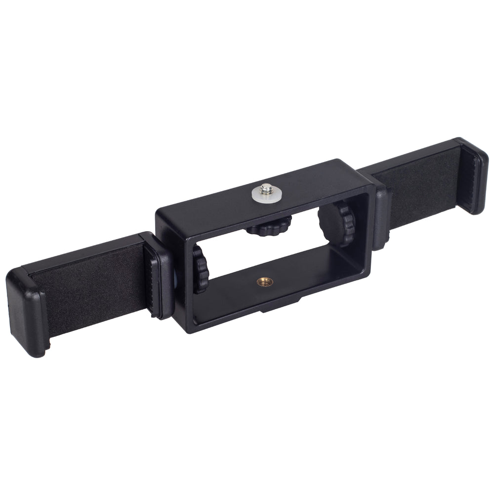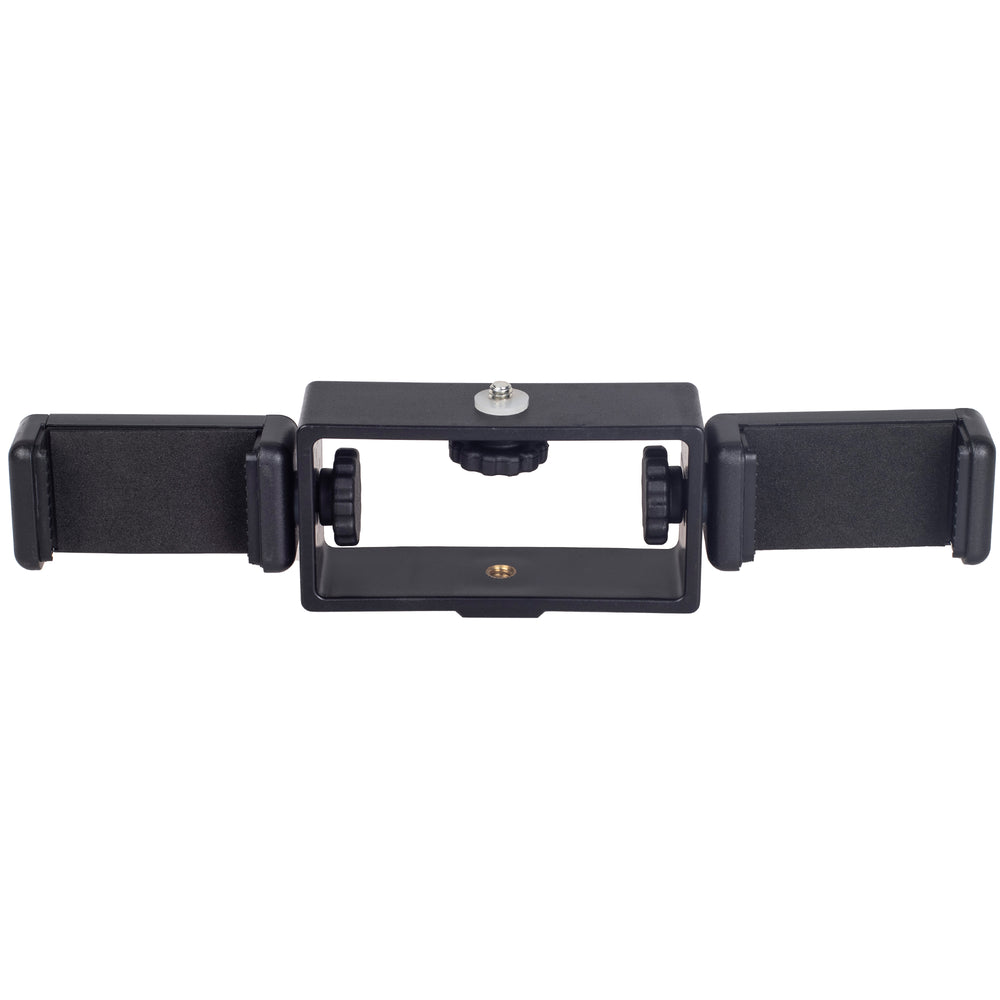Mit dieser Dual- Smartphone-Halterung können Sie ganz einfach zwei Smartphones auf einem Stativ oder Kamera-Blitzschuh nutzen. Die Halterung besteht aus einem flexiblem Montagerahmen auf dem zwei mitgelieferte Klemmen aufgeschraubt werden können, wahlweise für horizontalen oder vertikalen Betrieb z.B. Breitbild oder Hochkantvideos).