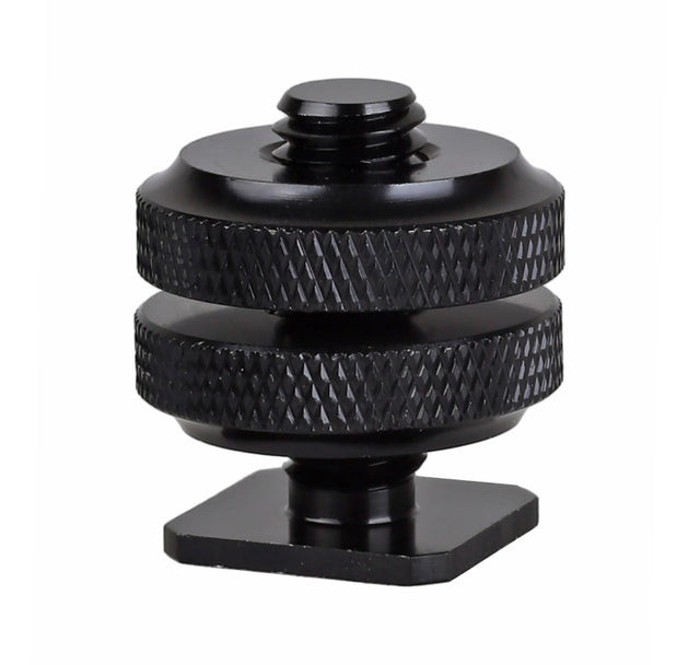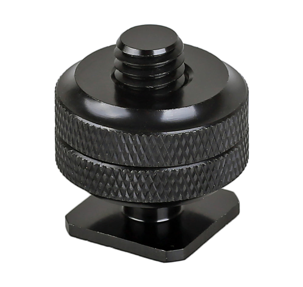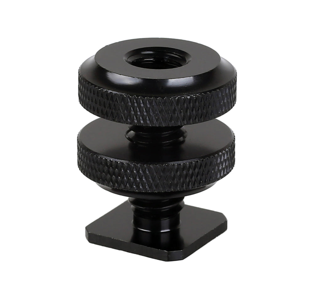 Dieser Adapter passt auf einen Standard-Blitzschuh und verfügt über ein 3/8 Zoll Gewinde für die Anbringung von Monitoren und anderem Zubehör.
