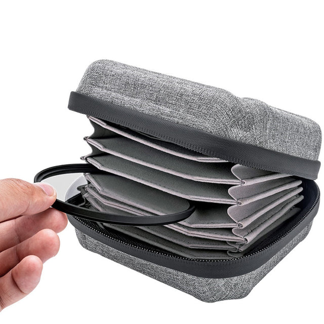 Diese Filtertasche bietet eine sichere und praktische Möglichkeit, bis zu zehn 95mm Rundfilter zu transportieren und aufzubewahren. Die Tasche schützt Ihre Filter vor Staub, Stößen und Spritzwasser, während sie kompakt und tragbar genug ist, um in einer Kameratasche verstaut zu werden. Das Außenmaterial der Tasche, verstärkt durch eine stabile Rippe, besteht aus hochwertigem EVA-Material, das robust und langlebig ist.