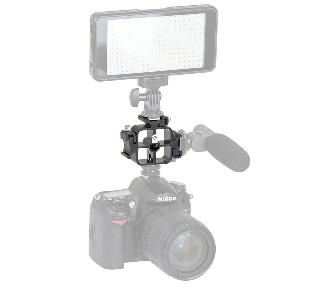 Dank drei unabhängigeeinstellbarer Metall-Blitzschuhe können Sie bis zu drei Zubehöre z.B. Blitz, LED-Licht oder Mikrofon auf dem Adapter montieren. Der Adapter kann auf einem Stativ oder Schirmhalter befestigt werden.