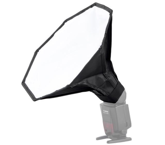 Mit dieser Softbox erhalten Sie weicheres Licht, wenn Sie mit einem Blitzgerät arbeiten. Dies ist besonders in der Portraitfotografie vorteilhaft. Die Oktagon-Form verteilt das Licht durch den weißen Stoff besonders gleichmäßig und lässt z. B. Augen sehr natürlich aussehen.Die Softbox besteht außen aus stabilem schwarzem Nylon und ist für eine hohe Lichtausbeute innen mit reflektierender Silberfolie ausgekleidet.