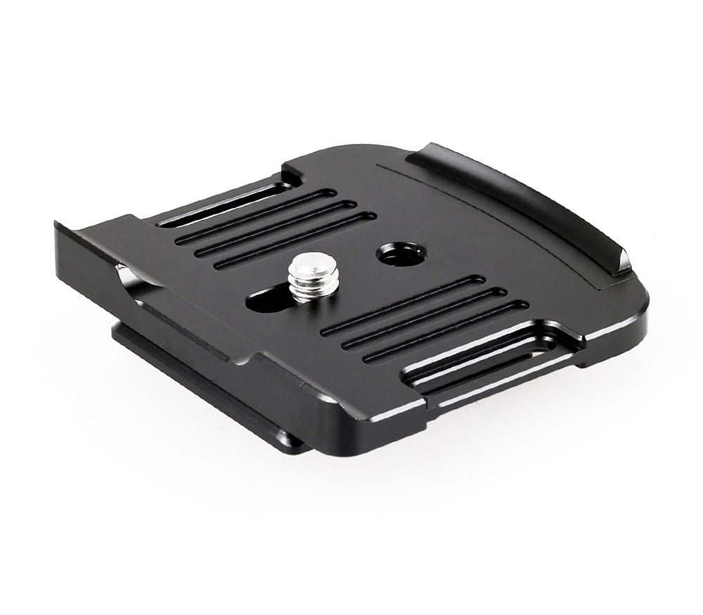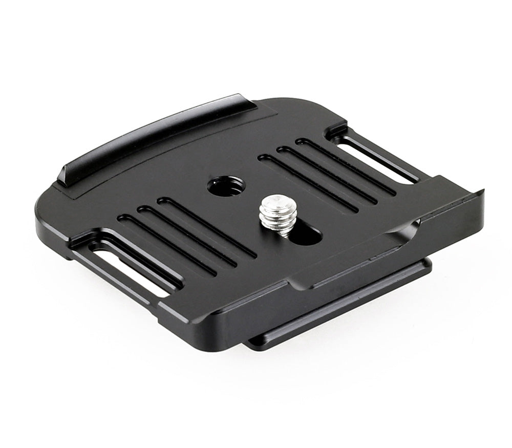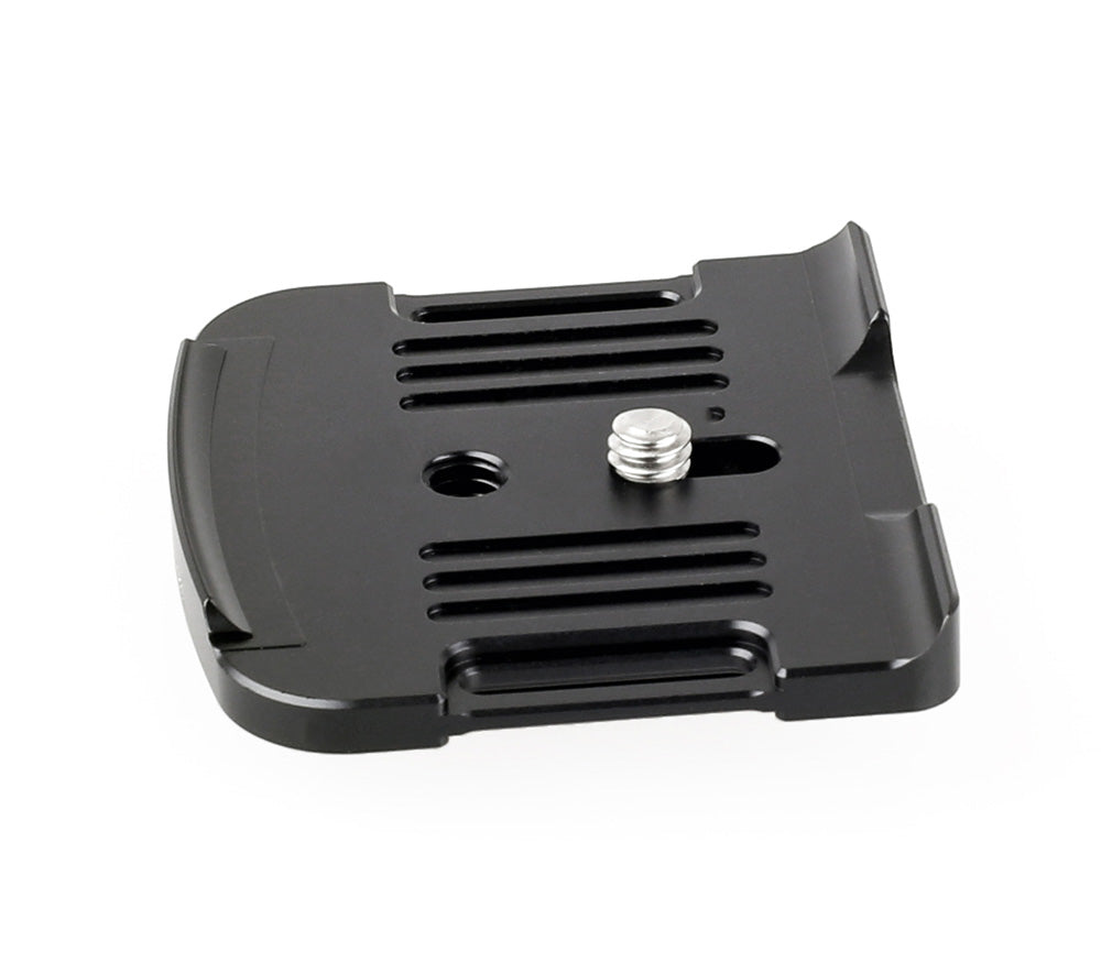 Die Kameraschraube lässt sich aufgrund ihres Bügels ohne Werkzeug eindrehen. Neben ihr befindet sich ein 1/4 Zoll Innengewinde, um z. B. einen entsprechenden Kameragurt anzubringen oder die Platte auf einem Gewinde zu montieren. Durch die beiden seitlichen Aussparungen kann ebenfalls ein Gurt bzw. eine Handschlaufe gezogen werden. Die Platte wurde mit CNC-Präzisionstechnik hergestellt und besteht aus einer hochwertigen Aluminium-Legierung. Technische Details: