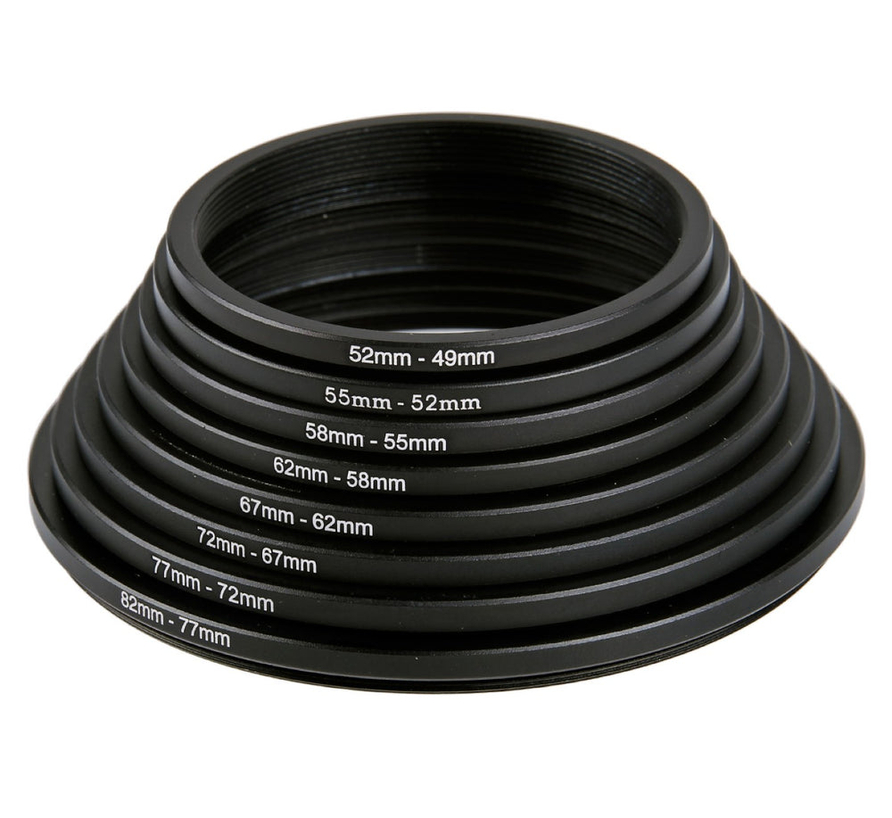Diese acht Step Down Ringe (Reduzierringe) ermöglichen es Ihnen, Filter, Konverter, Sonnenblenden und alles weitere Zubehör mit einem kleineren Gewinde an ein Objektiv mit größerem Gewinde anzubringen.